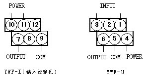 注: 1、YWF、YWL系列交流電流變送器輸入線從變送器外殼設置的穿孔穿過,不分極性。